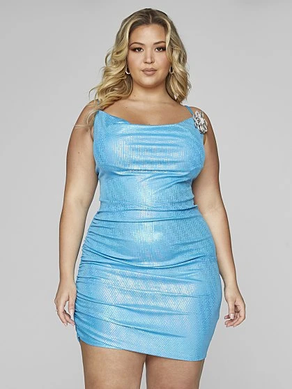 Shimmer your way into your next fancy party and turn heads wherever you go when wearing this blue stunner. This dress fits like a glove and showcases your curves in all the right ways. The stretchy fabric and side ruching are what makes this dress so curve-friendly. Pair with heels and a silver metallic clutch for a party-ready look.