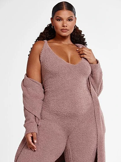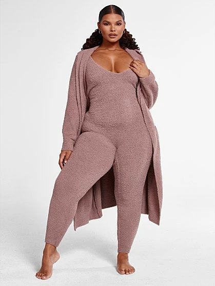 Our new Cuddle loungewear collection is all about everyday luxury coziness. Made from a soft fabric that feels like it’s enveloping you into a cozy warm cuddle, this jumpsuit is comfy but so chic and curve-loving. You’ll feel like you’re wearing pajamas but will look chic and stylish. Pair with the Cuddle Cardigan for the ultimate loungewear look.