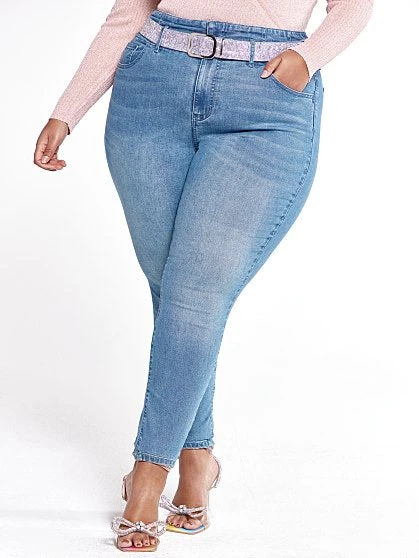 Our popular ultra high-rise skinny jeans remixed for the holiday season with a gorgeous rhinestone belt that gives these jeans a sparkling touch. Pair with the metallic cutout sweater from the SRV collection for a cute look that’s FTF Babe-approved.