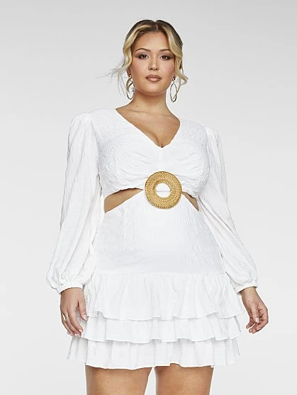 Look no more for that perfect dress to wear to your next all-white party this season. This one’s a definite head turner with its chic a-line silhouette and fun tiered ruffle hem. The woven belt buckle detail makes this dress a standout. The side cutouts give it a sexy touch. Pair with a woven neutral clutch and strappy sandals to complete the look.