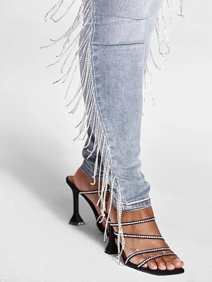 Be different this holiday season and wear jeans to your next holiday get-together. The rhinestone fringe along the sides of the legs elevates these jeans and makes a statement. With an ultra high waist, skinny leg and stretch, these jeans are a must-have. Pair with a dressy top and heels for the perfect head-to-toe holiday look.