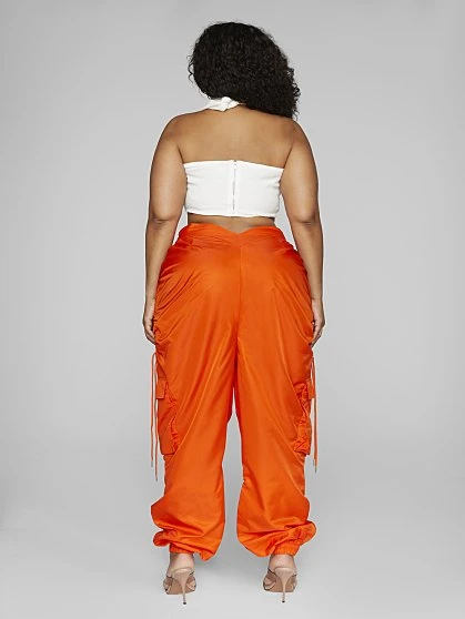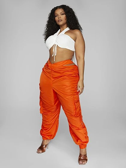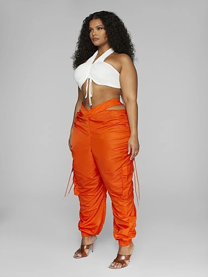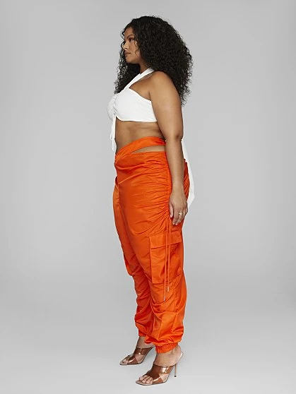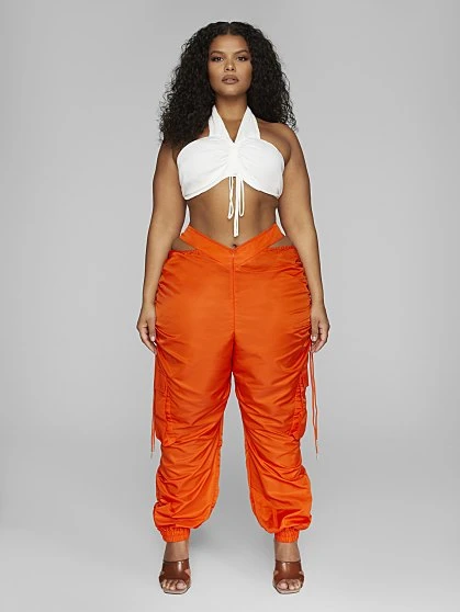 Streetwear-inspired with a sexy touch, these sleek cargo jogger style pants have a v-shaped waistband with side cutouts at the waist. The side ruching and drawstring detail spotlights your thick thighs in all the right ways. Pair with Leslie’s white halter top and heels for a fun look to wear for a night out with friends. From the Leslie Sidora x FTF Summer 2022 collection, featuring wear-now lightweight styles that offer versatility, color and comfort with a luxe feel.