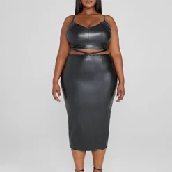 Fashion To Figure Chantel Leather Look Ruched Midi Skirt