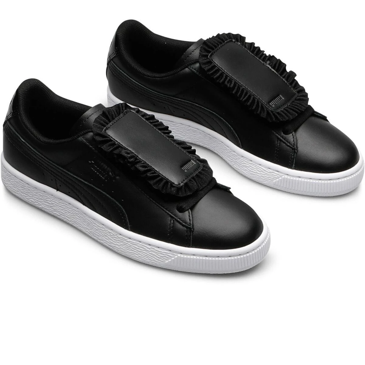 Featuring a triple-Black upper in leather, the shoes are classy and clean on their own, while the classic, White sneaker sole adds a dash of contrast. The most appealing piece of the shoe are the lively snap-button badges that come included, as one boasts a pastel graphic design while the other features an all black ruffled look. Wear them with or without the badges, getting three pair of kicks for the price of one!